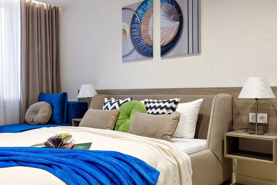 ️ Спальная зона: Кровать queen-size 160×200 с ортопедическим матрасом Askona, качественное постельное бельё, вместительный шкаф.