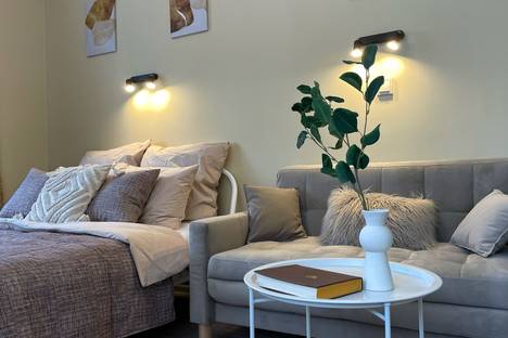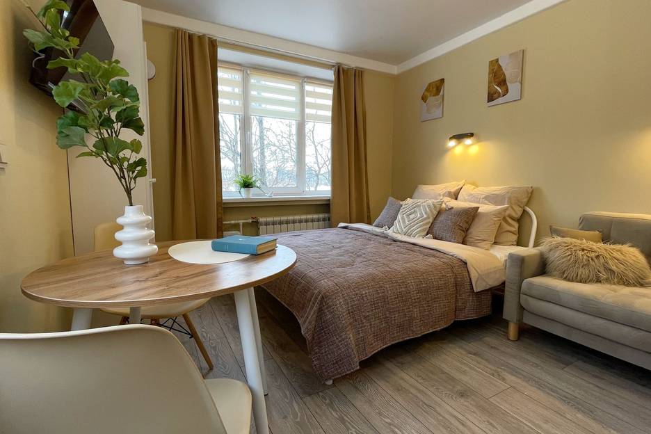 Уютная и светлая студия с видом на клинику. Теплая, с хорошей вентиляцией. Вместимость до 4 человек: ортопедическая двуспальная кровать Askona (160x200) + стильный раскладной диван в стиле лофт.