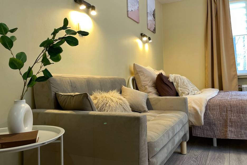Уютная и светлая студия с видом на клинику. Теплая, с хорошей вентиляцией. Вместимость до 4 человек: ортопедическая двуспальная кровать Askona (160x200) + стильный раскладной диван в стиле лофт.