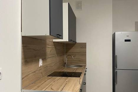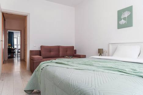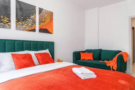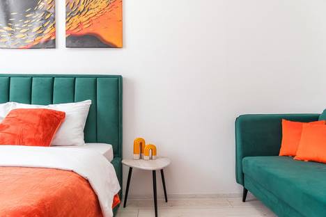 Апартаменты обставлен со вкусом новой современной мебелью в светлых тонах с яркими акцентами в кухонной и ванной зоне.