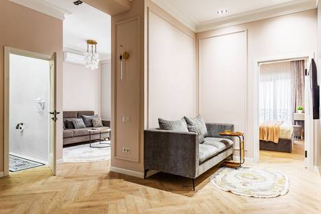Спальня оснащена большой двуспальной кроватью, мягким освещением и шкафом-купе. В гостиной — диван, который при необходимости можно использовать как дополнительное спальное место.