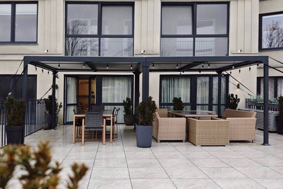 Терраса 70 м2. Закрыта от дождя и прямого солнца, подходит для круглогодичного использования.