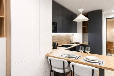 ● оборудованная кухня с индукционной плитой, холодильником, микроволновкой, посудомоечной машиной и электрическим чайником;
