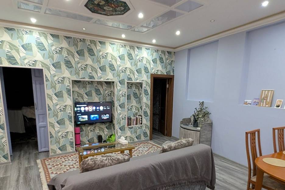 Квартира площадью 65 квадратных метров. Две изолированных спальни с двуспальными кроватями. Большая гостиная, совмещённая с кухней. В квартире есть всё необходимое для жизни.