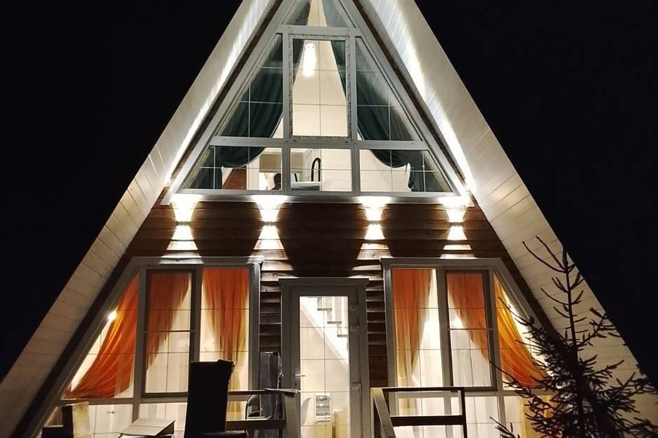 Просторный 2-этажный дом А-Фрейм с гостиной и 3 спальнями. В доме есть санузел и сухая сауна, все необходимое для комфортного проживания. В холодную погоду включаются тёплые полы.