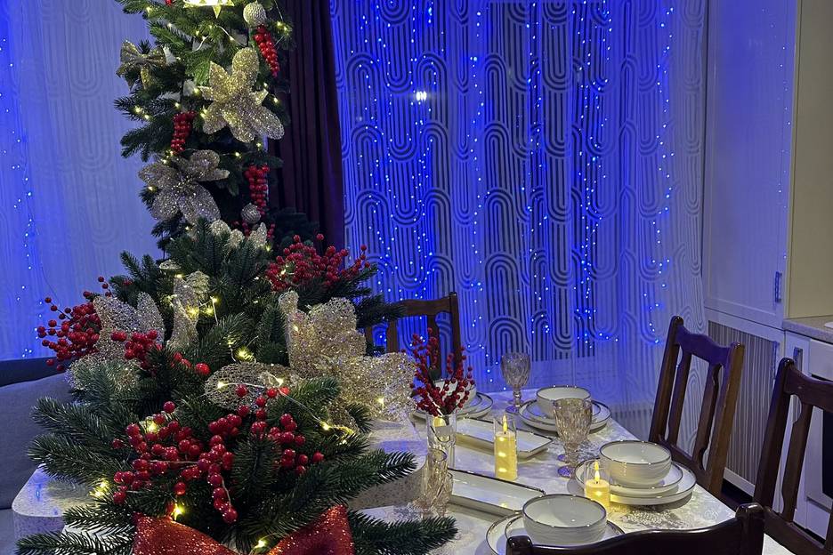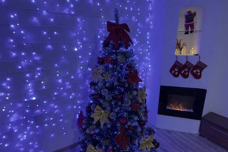 Квартира полностью подготовлена к праздникам — вас встретит нарядная новогодняя ёлка, тёплое сияние гирлянд, стильные праздничные украшения и красиво оформленные барные стойки.