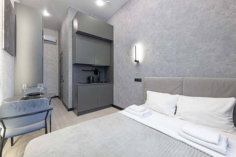 Стильная студия с собственной кухней в доме бизнес-классе. Идеально для романтических встреч, деловых поездок и семейного отдыха!