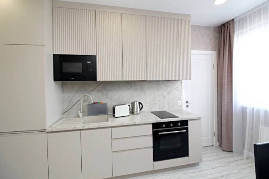 Полноценная Кухня-гостиная - оборудована всем необходимым: качественной бытовой техникой, столовыми приборами и посудой, имеется микроволновая печь, варочная панель, духовой шкаф, холодильник, обеденная зона , двухспальный диван-кровать , Вместительный шкаф и Smart TV.
