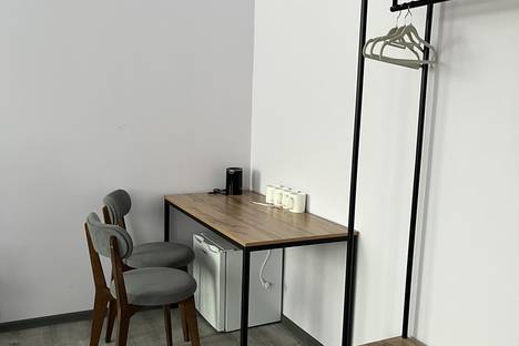 Номер стандарт №9 — Площадь: 25 m² — Тип: однокомнатный, современный стиль «лофт» — Вместимость: 4 человека ОПИСАНИЕ И ОСНАЩЕНИЕ — Спальная зона: двуспальная кровать 160×200,Диван ( раскладной) комплект постельного белья — Мебель: прикроватные тумбочки, стол, стулья, комод, прихожая — Техника и коммуникации: телевизор, Wi‑Fi, холодильник, электрический чайник, чайный набор — Ванная комната: душевая кабина, раковина, унитаз, фен, полотенца, туалетно‑косметические принадлежности, комфортное размещение на короткий и длительный срок
