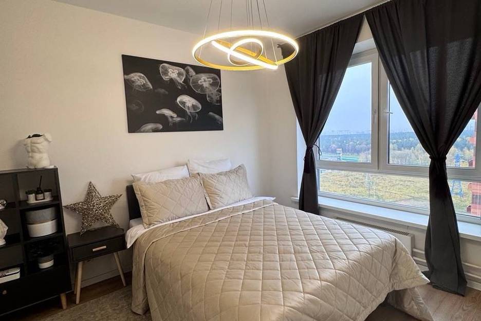 Интерьер выполнен в современном стиле с качественной отделкой. Просторная кухня оборудована всем необходимым для приготовления пищи. В гостиной установлен удобный диван и проектор. Спальня светлая, с большим окном, что обеспечивает хорошее естественное освещение.