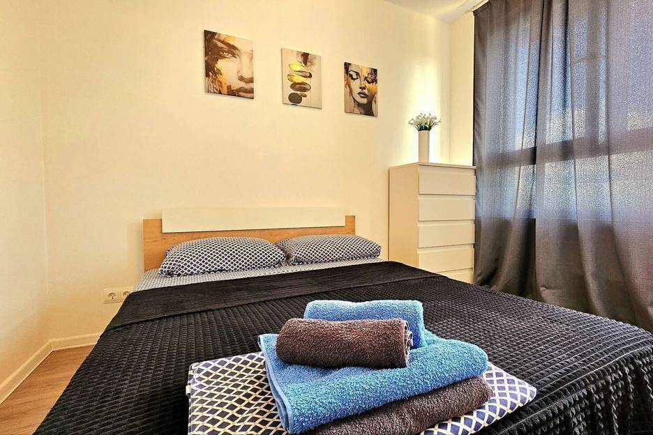 Что есть: Бесплатный WI-FI. Полностью меблирована: двуспальная кровать 140×200, двуспальный диван 140×200, шкаф , кухонный гарнитур, стол, стулья. Бытовая техника: телевизор, стиральная машина, холодильник, микроволновая печь, электрический чайник, утюг, фен. А также все необходимое для проживания: постельное белье, комплект полотенец, вся посуда, сушилка для белья, гладильная доска.