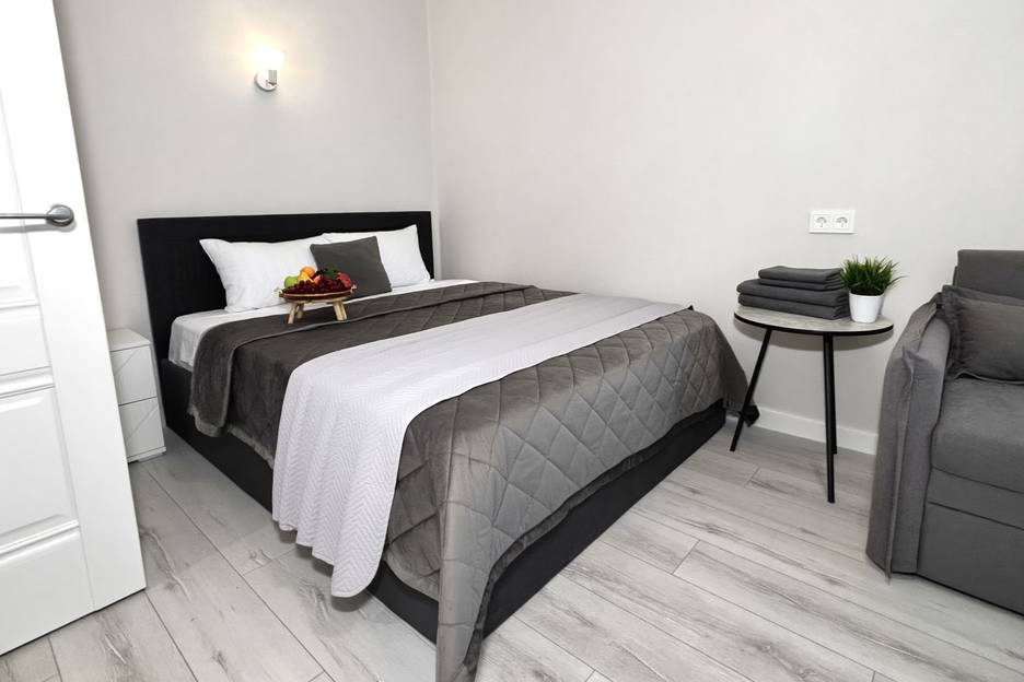 двуспальная кровать (160х200 см) двуспальный диван (120х200 см) оборудованная кухня (холодильник, варочная панель, микроволновая печь, чайник) стиральная машина, фен, утюг, гладильная доска, сушилка для одежды, водонагреватель на случай отключения воды набор посуды и столовых принадлежностей на 4 персоны цифровое ТВ и высокоскоростной Wi-Fi шампунь, гель для душа, жидкое мыло чай, соль, сахар Чистое постельное бельё и полотенца высокого качества. Каждому гостю предоставляется по 2 полотенца. Замена белья и полотенец при бронировании свыше 7 суток бесплатно. В иных случаях за дополнительную плату.
