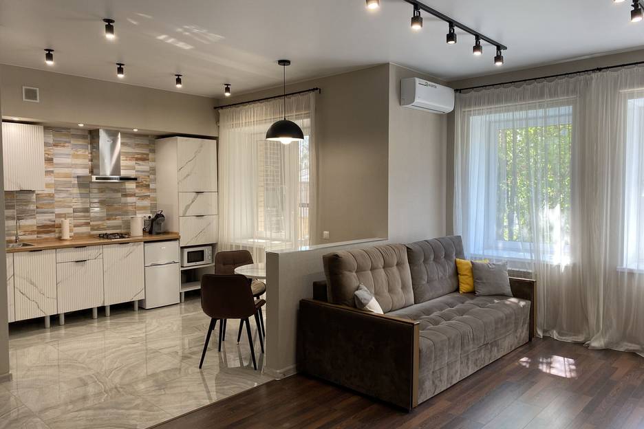 Квартира имеет очень удобную просторную планировку, где кухня и гостиная объединены в одном пространстве. Для кровати подготовлен специальный уголок, чтобы вы смогли прекрасно выспаться. У нас есть лоджия, на которой очень приятно посидеть в солнечных лучах, пробивающихся сквозь листву, выпить чашечку чая под неспешный разговор.