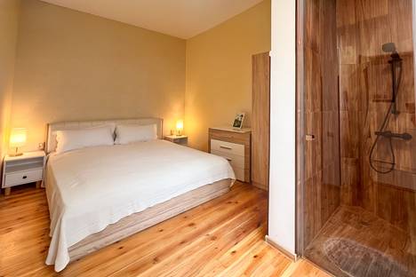 Спальня: большая двуспальная кровать, шкаф, прикроватные тумбы, комод. Спальня очень тихая, окна выходят в закрытый двор. Часть спальной отделена под душевую зону с раковиной (обратите внимание, что душевая не в отдельной комнате!).