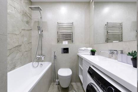 Ванная комната: Просторная ванна, набор косметики, фирменные пушистые полотенца, фен и стиральная машина.