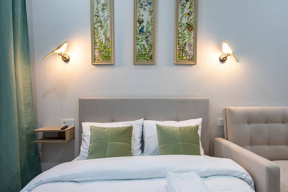 В апартаментах мы сможете отдохнуть и набраться сил на кровати с ортопедическим матрасом 140х200. Прекрасное сатиновое белое постельное белье позволит вам отлично выспаться.