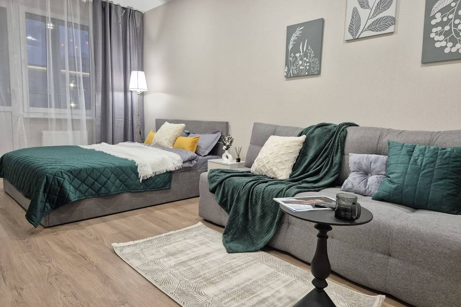 • Дизайн и атмосфера: Интерьер квартиры создан в гармонии спокойных современных оттенков — серого, бежевого и приглушённо-зелёного. Элементы декора, такие как картины с растительными мотивами и мягкое освещение-торшер наполняют пространство атмосферой уюта и расслабления.