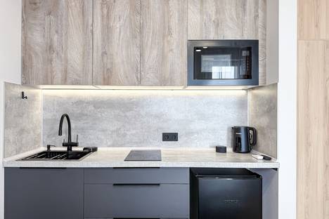 » Кухонная зона со всем необходимым: варочная поверхность, чайник, микроволновка, холодильник, посуда и кухонная утварь;