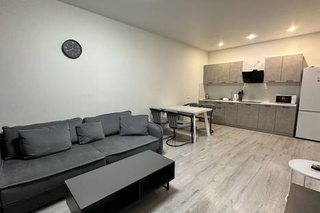 Апартаменты обставлены со вкусом новой современной мебелью в светлых тонах с яркими акцентами в кухонной и ванной зоне.