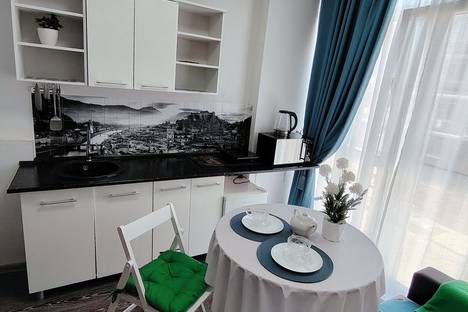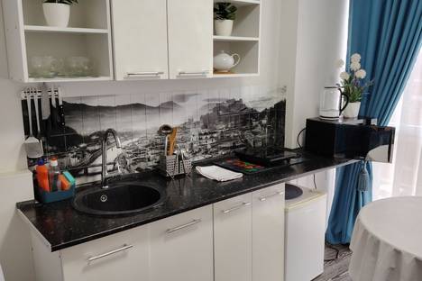 — Кухня-студия с индукционной плиткой, микроволновкой, холодильником, тостером и всей необходимой посудой