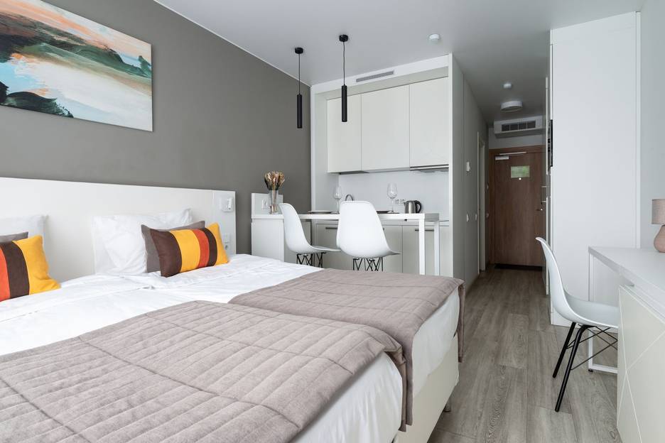 • Две односпальные кровати 90×200 (по умолчанию застилаются как двуспальная, можно разделить по запросу).