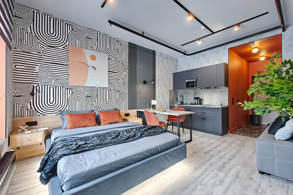 техника: Smart-TV, безлимитный Wi-Fi, холодильник, СВЧ, варочная панель, электрический чайник, стиральная машина, водонагреватель, фен, утюг, кондиционер* (установка планируется в мае)