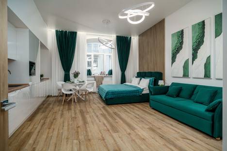 Студия отличается ощутимым простором — площадь 43 м², огромные окна и высокие потолки создают лёгкость и гармонию. Благодаря продуманной планировке пространство выглядит ещё более уютным: здесь приятно дышится, свободно двигается и комфортно живётся даже нескольким гостям одновременно.