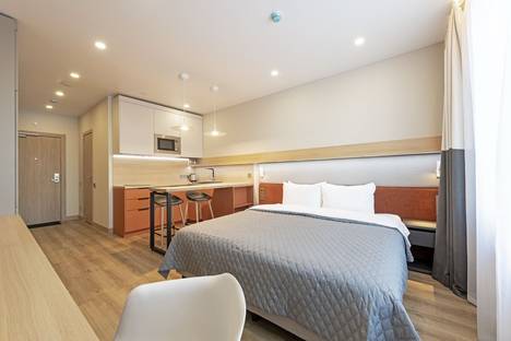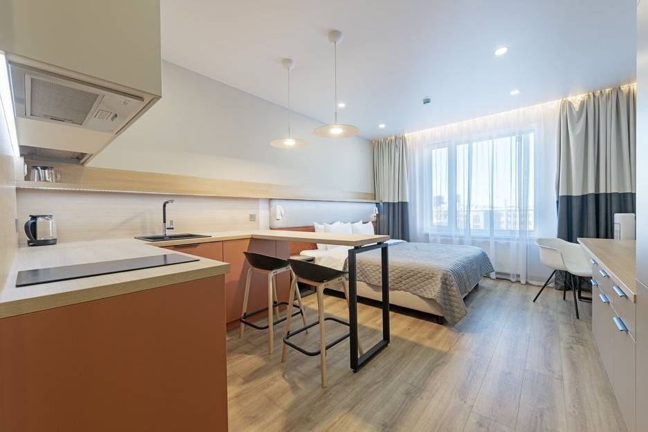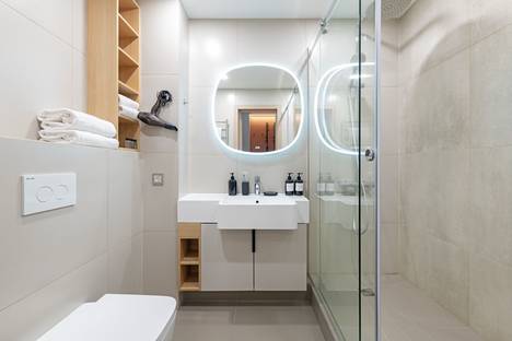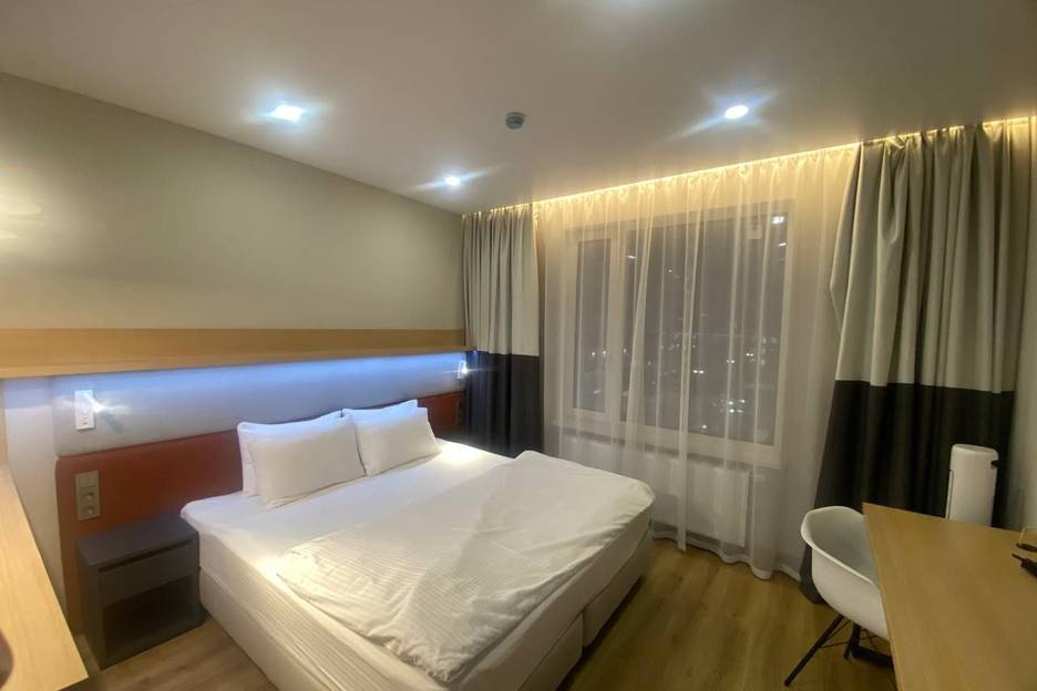 - В местах отдыха: постельное белье на каждого гостя, ЖК телевизор со Smart TV, высокоскоростной Wi-Fi бесплатно, зеркало в полный рост, шторы блэкаут, рабочее место.