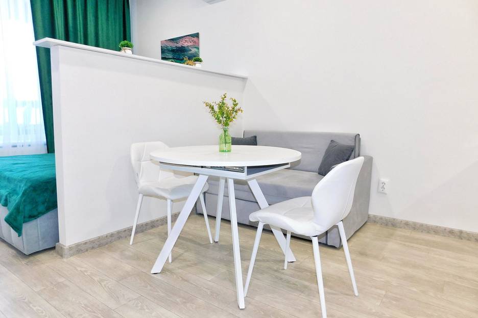Сдается светлая уютная студия площадью 29 кв.м. с современным ремонтом. Уютная зона отдыха с большой двухспальной кроватью и диваном, который при необходимости можно использовать, как полноценную кровать. Полностью оборудованная кухня с обеденной группой. А еще есть прекрасный видовая лоджия с барной стойкой и стульями, где можно насладиться чашечкой ароматного кофе.