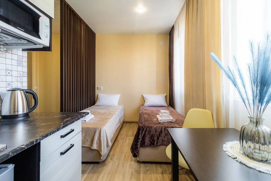 Cтудия c новoй, cовременнoй, а cамоe глaвное комфopтной мебелью. В квартире организовано 2 спальных места (кровать спринг-бокс с возможность трансформации из 2 односпальных в 1 двухспальную кровать). Пожалуйста, сообщайте какая кровать Вам нужна, Односпальная или Двухспальная.