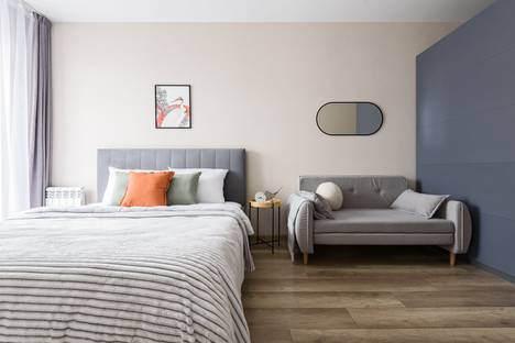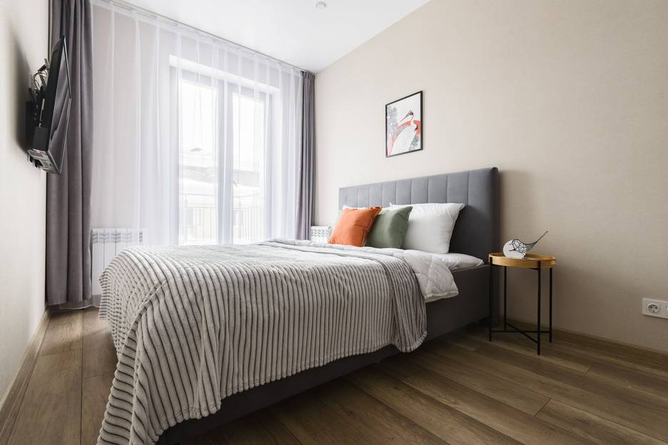 Удобную двуспальную кровать с ортопедическим матрасом и раскладной диван для двух дополнительных мест.