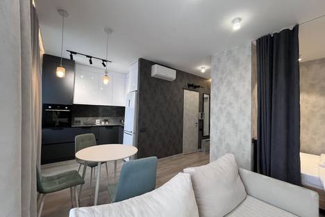 Кухня-студия: индукционная панель и духовка. Вытяжка, холодильник и посудомоечная машина. Фильтр для чистой воды. Полный набор посуды и столовых приборов. Обеденный стол на троих