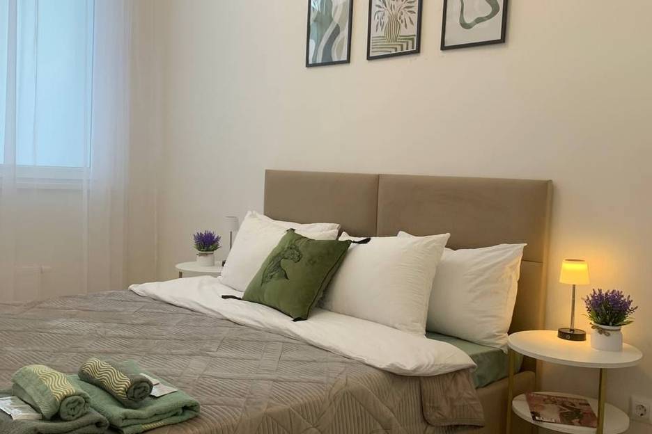 В квартире имеется отдельная спальня с широкой кроватью, ортопедическим матрасом, ЖК-телевизором со смарт-ТВ, шкафом, а также рабочим местом. В гостиной-кухне есть двухспальный диван. Кухня оборудована всей бытовой техникой. Также имеется всё необходимое для отдыха и работы: wifi, холодильник, стиральная машина, электрический чайник, кофемашина, СВЧ, фен, утюг, гладильная доска, посуда.