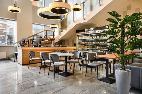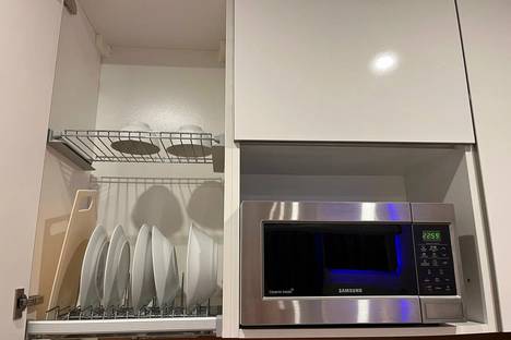 Кухня: полноценная зона с обеденным столом, холодильником, микроволновой печью, посудой и кофемашиной.