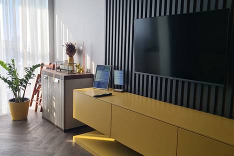 Гостиная: Большой диван (раскладывается), Smart TV с подписками на различные сервисы, рабочий стол для ноутбука.