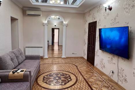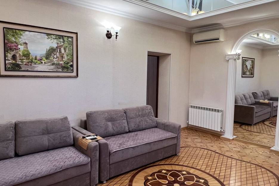 - Уютная гостиная комната (2 дивана-кровати, размер спального места 150х200 (полноценная двухместная кровать), большой телевизор, паркет, красивый зеркальный потолок).
