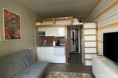 В студии, предусмотрено два спальных места: двухспальный диван, и двухспальный матрац « Аскона» на втором уровне.