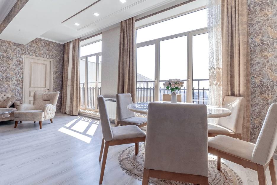 • Гостиная с диваном, телевизором, журнальным столиком и обеденной зоной на 6 человека