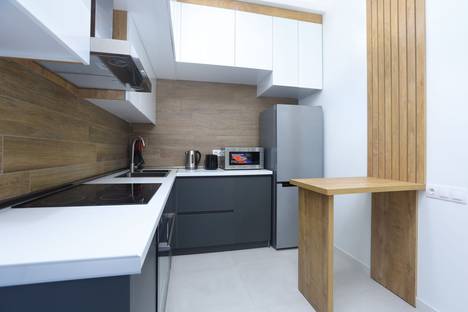 • Полностью оборудованная кухня: плита, холодильник, микроволновка, чайник, стиральная машина, кастрюли и посуда, духовка
