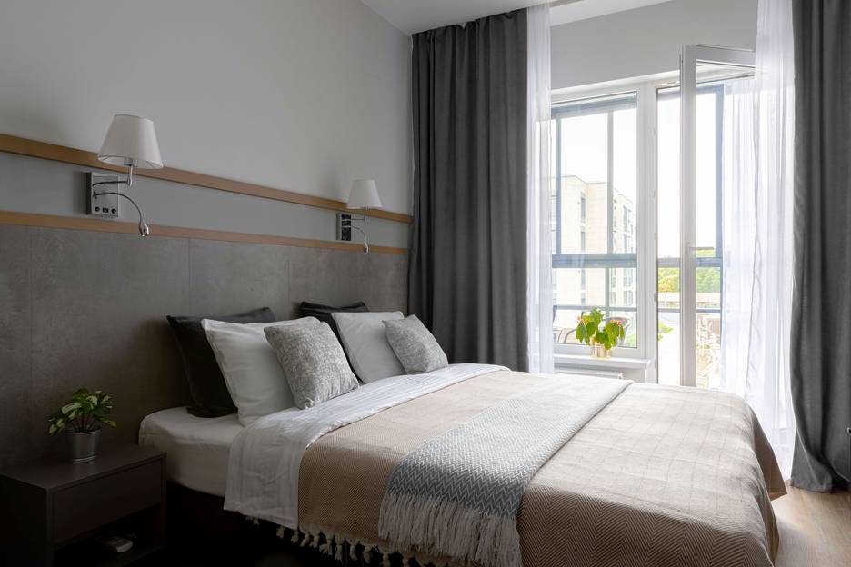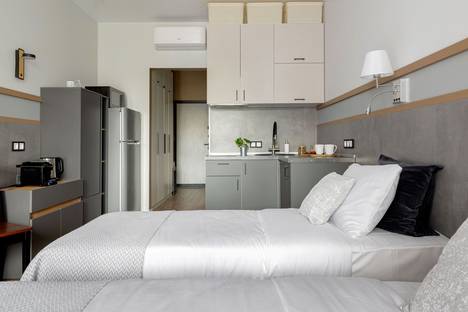 Квартира оборудована удобной двуспальной кроватью-трансформером, которую при необходимости можно разделить и организовать два отдельных спальных места.