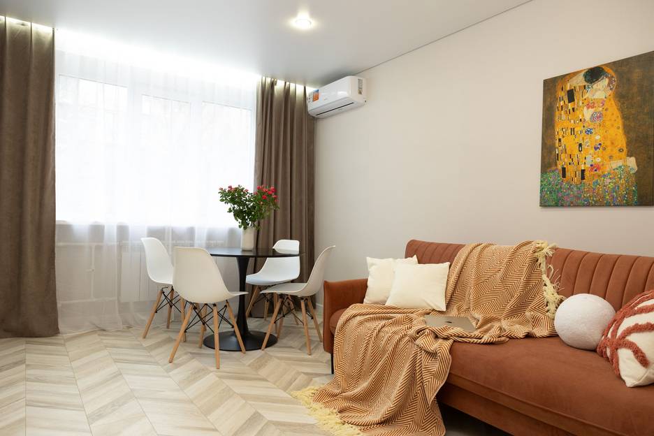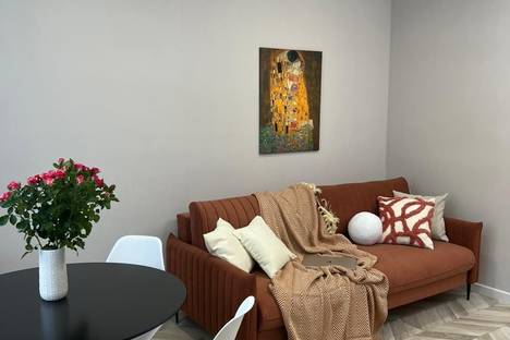 В спальне большая двуспальная кровать 180х200 с ортопедическим матрасом. Постельное и полотенца предоставляются. В зале удобный двуспальный диван. Современный интерьер располагает к спокойному отдыху. В каждой комнате Сплит система и телевизор с WiFi.