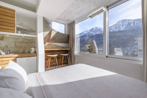 Уникальная студия с авторским дизайном и душой в каждой детали. Здесь вы встретите — только натуральное дерево, камень и премиальная отделка, создающие ощущение настоящего горного уюта. Главная магия — чувственная ванна у панорамного окна на двоих. Представьте: тёплая вода, бокал игристого и закат, окрашивающий вершины в золото. А 5-метровое окно во всю стену дарит ощущение, что вы парите над горами прямо из кровати.