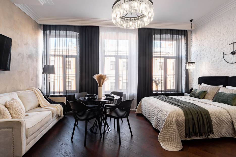 Квартира на Невском 22-24 большая, но не уютная, совсем не выглядит жилой просто место где можно переночевать но не жить, ощущение что нашли свободную мебель и приволокли в квартиру что было)) вся мебель и люстры разных цветов и разных стилей, в ванной смешное пластиковое зеркало, занавески в одной спальне не пойми какие и не было блэкаут из-за этого утром плохо спалось, также окна спален выходили на шумную улицу с открытым окном спать проблемно, а с закрытым душно ибо кондиционер был только в одной спальне. Действительность не совпадает с фото, в реальности не было ковров, зеркала во весь рост в спальне, часов, ваз, полы и двери скрипят).В Петербурге не первый раз, но впервые столкнулись с тем что нужно платить за уборку при выселении это 4500 р. при этом должны сами помыть посуду и вынести мусор, ну ок обычно всегда сами это и делаем при выезде, но как бы везде уборка включена в стоимость аренды квартиры.Не рекомендую, менеджеры придумывают как хотят, не факт что вас заселят туда куда вы бронируете и еще и нервы помотают, да и по факту получается дешевле снять отель с завтраками и уборкой.