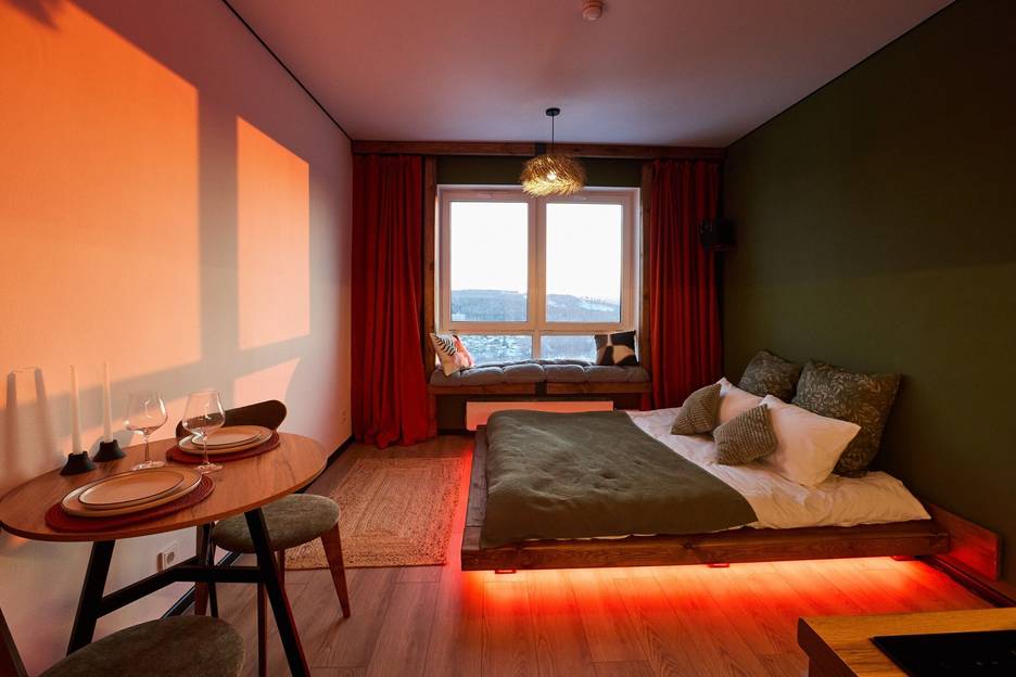 Эта студия создана для романтических свиданий, особенных вечеров и отдыха вдвоём — когда хочется тишины, уединения и ощущения, будто весь город остался где-то далеко.
