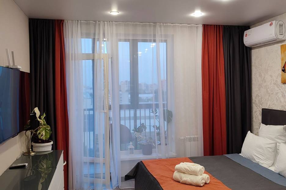 Современная квартира-студия с панорамными окнами в новом ЖК «Балканы». Большие окна открывают захватывающий вид на город, а хороший ремонт и продуманный интерьер создают уют для вашего отдыха.