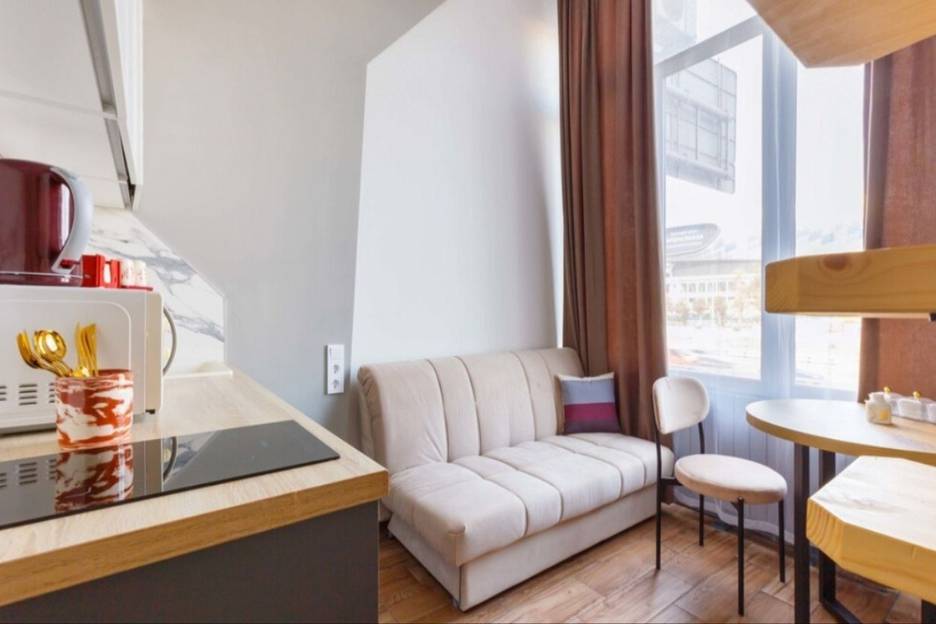 Квартира небольшая, компактная, максимум на 4 человека, есть необходимая посуда, плита, микроволновка, стиральная машина. Всё работает. Немного жарковато из-за полов с подогревом, но это лично мои предпочтения.