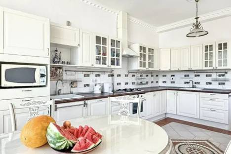 Кухня оборудована кофемашиной, посудомоечной машиной, плитой, духовкой, холодильником, двумя раковинами, системой фильтрации питьевой воды, посудой и обеденным столом на 12 человек.
