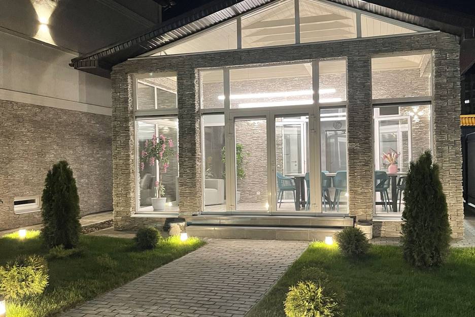 Новый, современный отель 2021 года постройки включающий в себя красивую и ухоженную ландшафтную территорию, витражную баню на дровах с купелью, беседки с мангалом, парковку для автомобилей с видеонаблюдением.