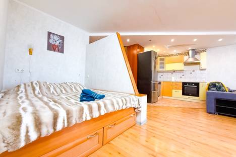 Большая студия с кухонной зоной и просторной гостиной, с кроватью (два спальных места) и диваном (два спальных места).