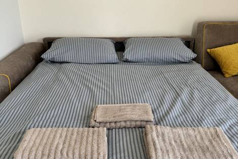 В гостиной стоит диван, который раскладывается в полноценную двуспальную кровать по принципу "раскладушка" с полноценным матрасом (плюс мягкий намотрасник), в кухне - раскладной диванчик (дополнительное спальное место), по запросу можем предоставить детскую кроватку.